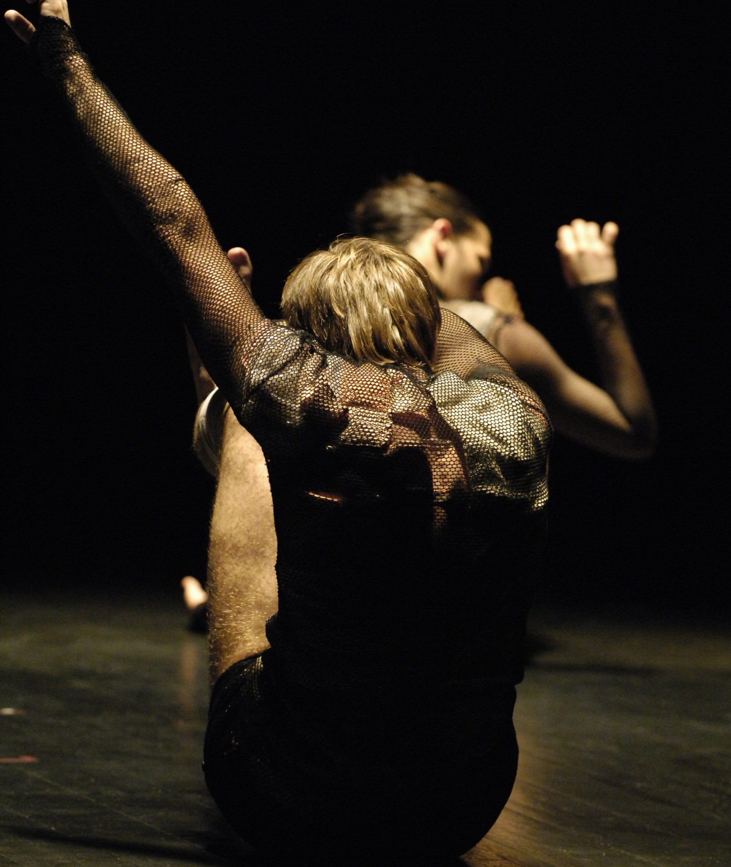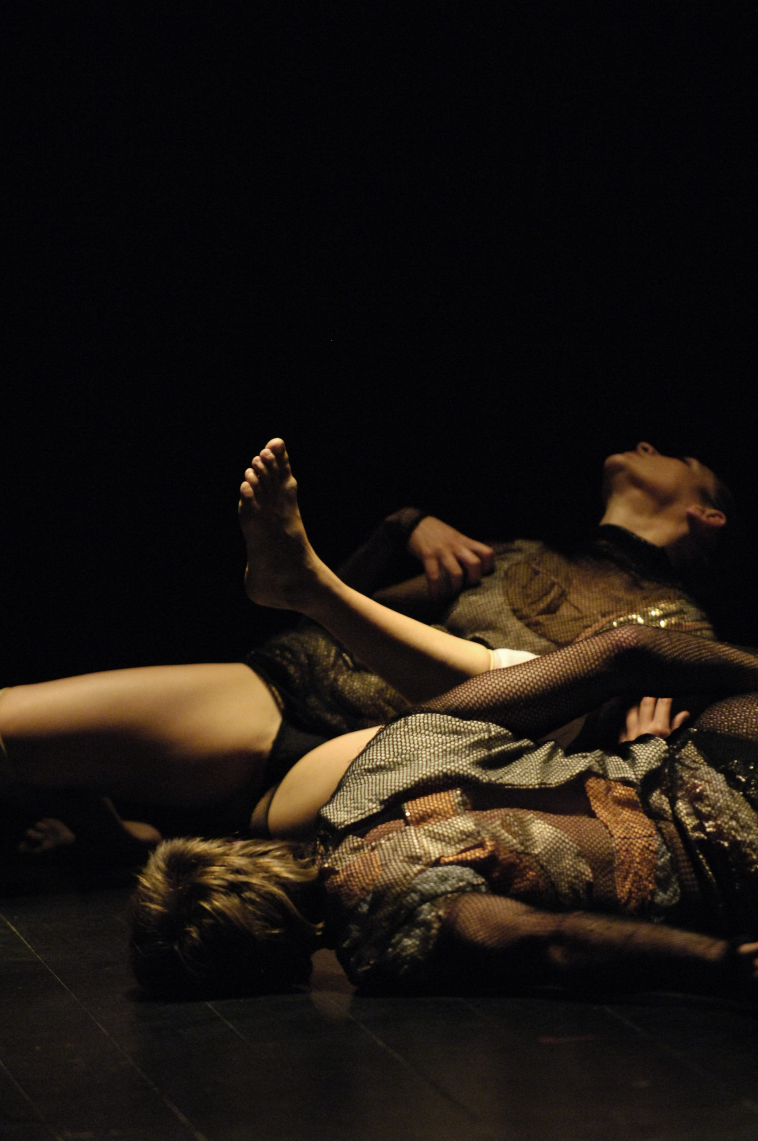 « Cela démarre fort. Et en même temps mol­lo. Tout en déli­ca­tesse, en légè­re­té, mez­zo voce – et sen­za luce. Par une infi­nie ouver­ture au noir. Une lente trouée en iris. Au bout d’un cer­tain temps, comme dirait l’autre, quelques lou­piots mor­do­rés fixés au pla­fon­nier et com­man­dés à dis­tance par Valé­rie Sig­ward pro­filent un halo à l’intérieur duquel, toutes pupilles dila­tées, le public sevré de figure ou de signe finit par dis­tin­guer quelque chose. Un spectre, en l’occurrence, puis un second. Deux corps, encore indé­ter­mi­nés sexuel­le­ment, vêtus sem­bla­ble­ment, les jambes et pieds dénués. Pro­gres­si­ve­ment, tout ce petit monde se met en mou­ve­ment, en ordre de marche. En branle mais pas pour autant en branle-bas de combat.